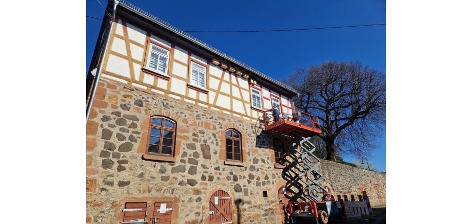 Gesagt, getan: Helmut Michel (Vorsteher Turnverein), Carsten Schreiner (Vorsteher Haus der Begegnung) sowie Matthias Kristen und André Hülsbömer vom Ortsbeirat fassten sich ein Herz und schufteten Gründonnerstag und Ostersamstag von der Früh bis in den Abend. Die Kosten für Leihmaschinen vom Geräteverleih Wetterau und denkmalschutzgerechtes Material trug die Gemeinde, dessen Bauhof zwischenzeitlich den Weißbinder Thomas Wirth schickte, um im Durchgang schadhaften Wandputz vorm Streichen noch rasch auszubessern. Wie gefährlich die Arbeiten letztendlich waren, konnte man an der blutroten Nase Carsten Schreiners am zweiten Tag erkennen.